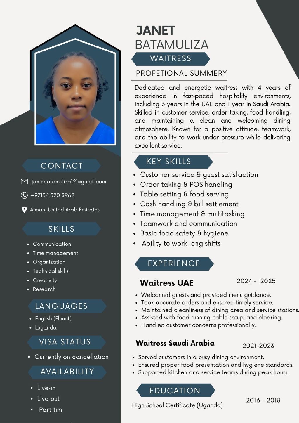 أنا جانيت من أوغندا، ولدي خبرة ثلاث سنوات في مجال تقديم الطعام. أستطيع العمل لساعات طويلة أتمتع بمهارات خدمة ممتازة. أنا متاحة للعمل بدوام جزئي، كما انني أسكن خارج المنزل