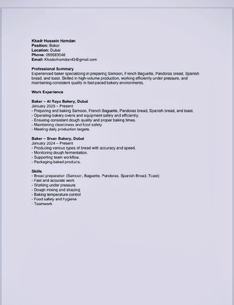 شيف معجنات وصفيحة شامية ولحم بعجين الحلبي بخبرة 12 سنة في مجال المعجنات الشرقية منها سنوات خبرة عملية داخل دولة الامارات امتلك خبرة واسعة في تحضير جميع أنواع المعجنات والصفيحة الشامية بجودة عالية وطعم مميز يلبي متطلبات المطاعم والمخابز الراقية الالتزام بالنظافة ومعايير السلامة الغذائية القدرة على تنظيم العمل والانتاج اليومي بكفاءة مميزات سرعة في الانجاز ابحث عن فرصة عمل مناسبة للتواصل