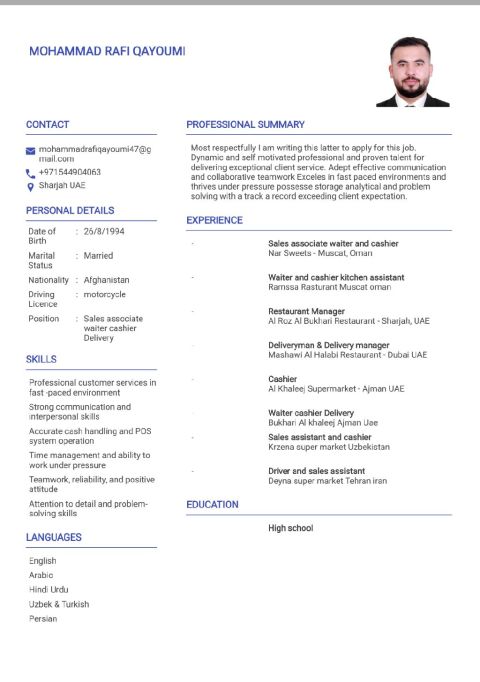 I am an Egyptian young man, 28 years of experience in the field of restaurants, Captain Order in Dubai, 3 years of experience in the country and I am looking for a job opportunity