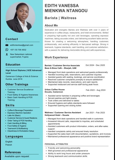I am a young Cameroonian seeking for a barista job in the UAE. With 1 + year of experience in the UAE. I am ready to join immediately. Kindly review my CV below