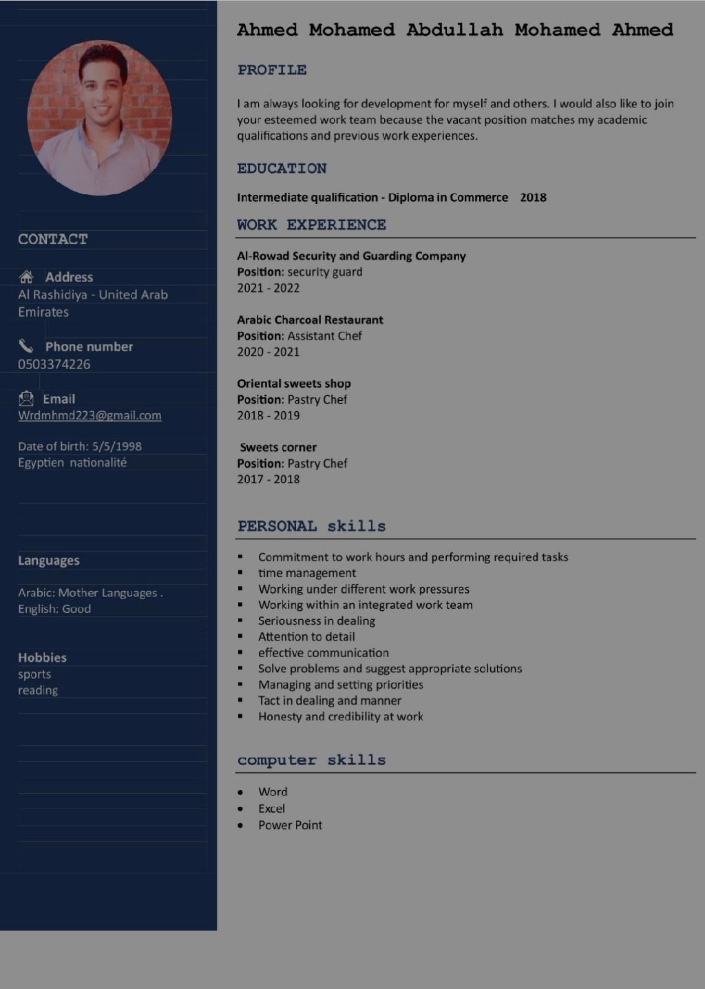 الاسم أحمد محمد عبد الله العمر 27 سنة مقيم بقي لي سنتين في الامارات أقدم موقعي الحالي في عجمان أني أريد للعمل وايتر مساعد شيف على شغل في أي مجال في المطاعم