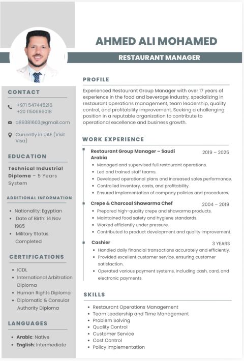 شاب مصري مؤهل جامعي خبرة داخل الدولة أكثر من 12 سنة ادارة مطاعم أحمل ليسن اماراتي وخبرة بالمشتريات والموردين وحساب التكلفة وزيادة المبيعات بإذن الله ابحث عن فرصة عمل مناسبة