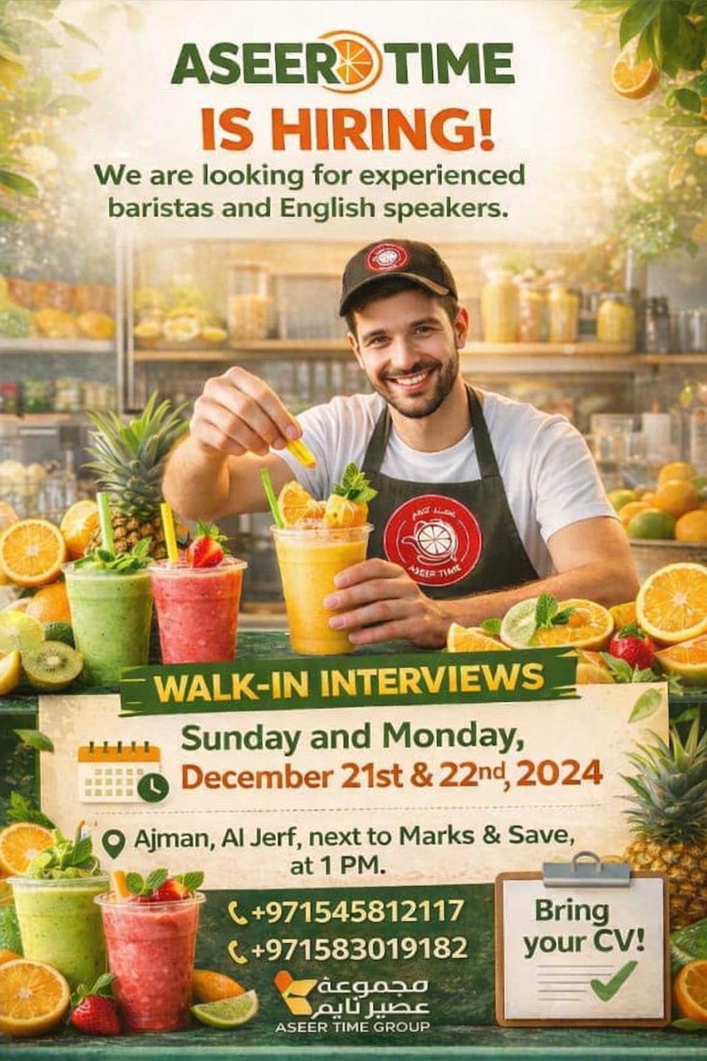 Juice Time Group is hiring We are looking for experienced baristas and English speakers. Aseer Time Group is recruiting experienced candidates for interviews on Sunday and Monday, December 21st and 22nd. Please come to our address in Ajman, Al Jerf, next to Marks & Save, at 1 PM. Bring your CV