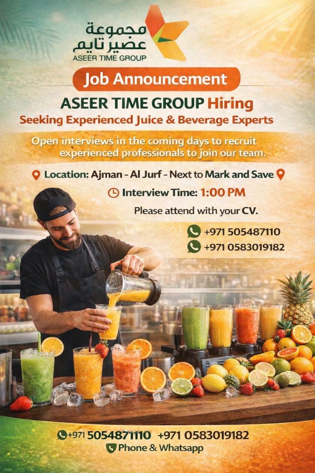 Asser Time Group announces open interviews in the coming days. We are looking for juice maker experts. Interviews will be held directly with HR. Aderes Ajman Al Jerf Next Mark and save Contact us