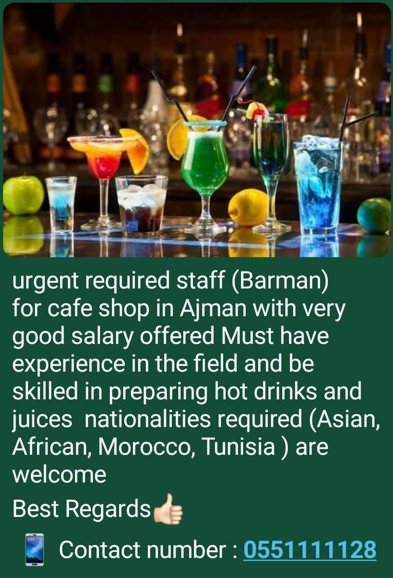 Urgent required staff Barista for cafe shop in Ajman Rashidiya 1 with very good salary offered must have experience in the field and be skilled in preparing hot drinks and juices