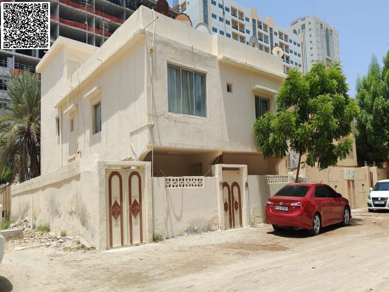 Building for sale in Ajman, Al Bustan area. It consists of two apartments one with 3 bedrooms, a large living room, and 2 bathrooms, and the other with 5 bedrooms, a living room, and 2 bathrooms. Each apartment has a separate entrance. The total area is 2000 SqFt. The building permit is for a ground floor plus one floor, with the possibility of a permit for a ground floor plus four floors. The building
