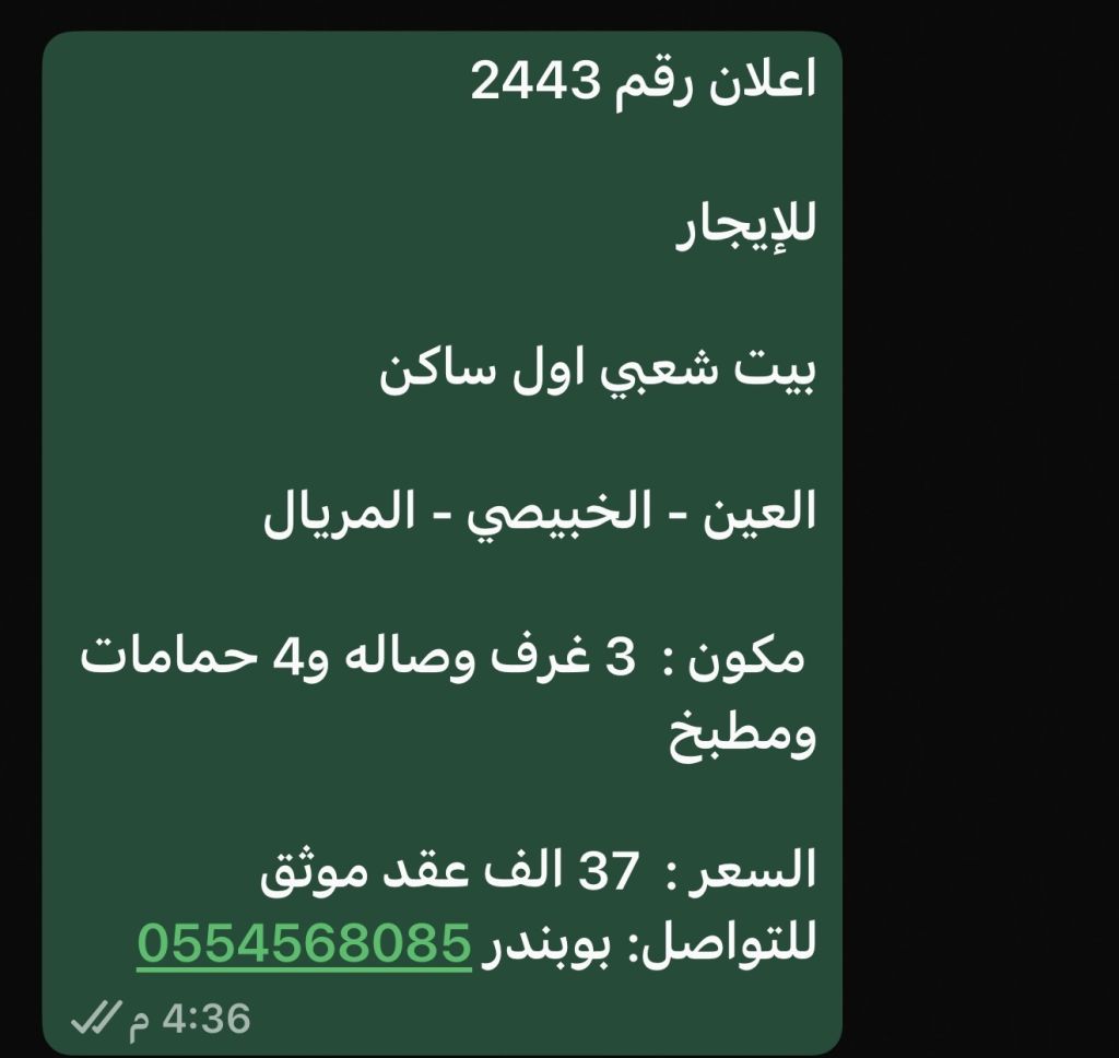 اعلان رقم 2443 للإيجار بيت شعبي أول ساكن - الخبيصي - المريال مكون 3 غرف وصالة و4 حمامات ومطبخ السعر 37 ألف عقد موثق للتواصل بوبندر