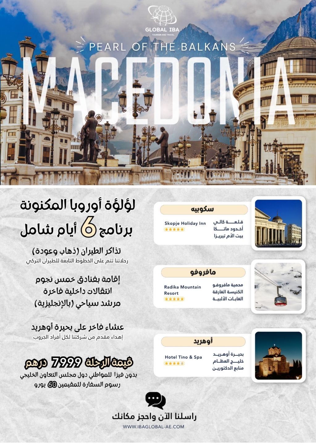 مقدونيا الشمالية مفتاحك للدخول أوروبا وفيزا الشنغن عايز تعرف أزاي كلمنا أو تنورنا في الشركة على عنوان عجمان الرميلة 3 دوار رونا فوق ذكريات الشام أوفيس 101 شركة Global IBA مواعيدنا يومينا من 10 الى 6