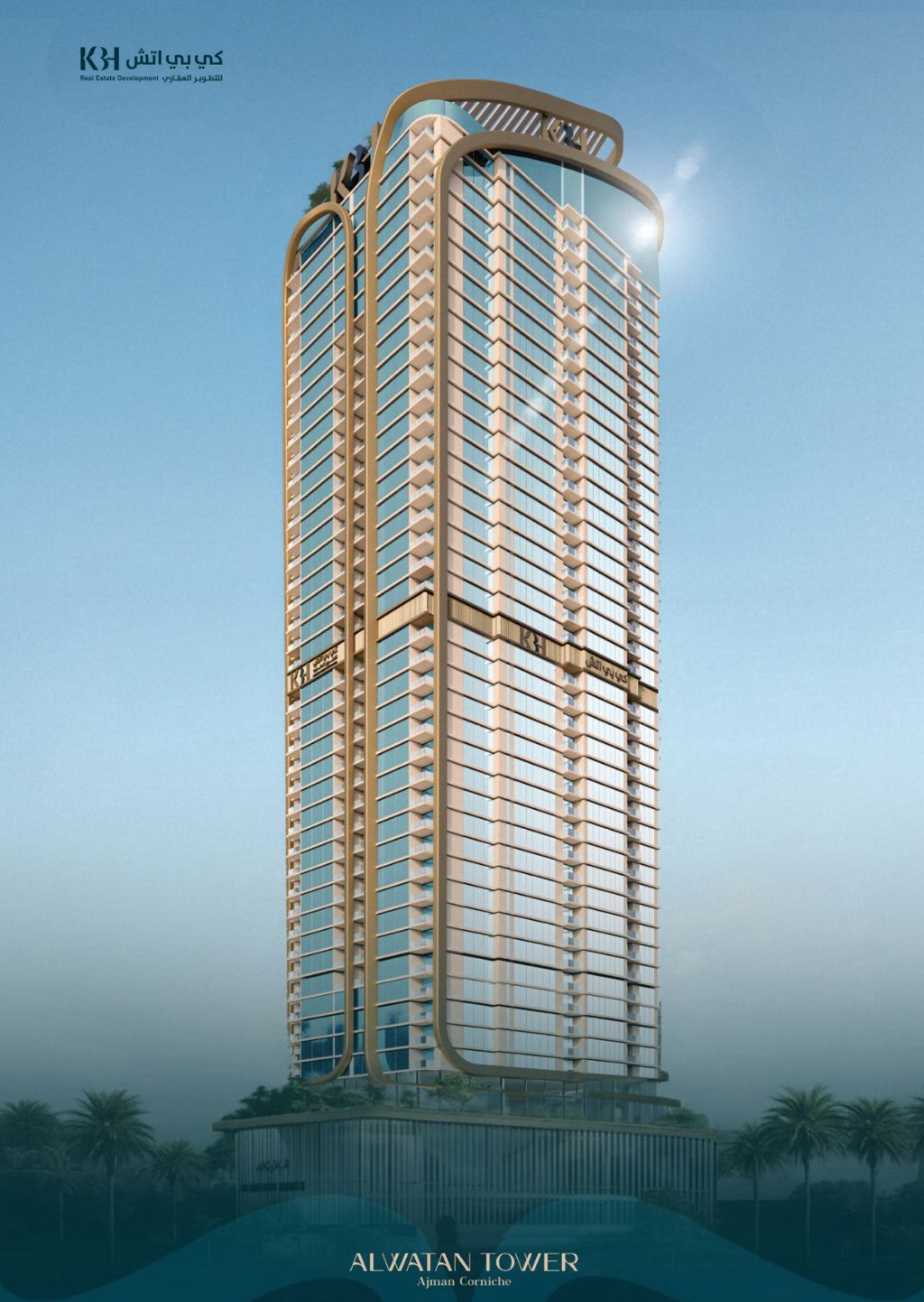 برج الوطن - كورنيش عجمان برج سكني أيقوني جديد يقدم حياة راقية على الواجهة البحرية في قلب كورنيش عجمان. الأسعار والمساحات المبدئية غرفة نوم واحدة - 999000 درهم اماراتي 1369 قدم مربع غرفتا نوم - 1433000 درهم اماراتي 1800 قدم مربع أبرز معالم المشروع برج سكني فاخر يضم اجمالي 390 وحدة 312 × غرفتي نوم 78 × غرفة نوم واحدة مرافق عالمية المستوى بركة سباحة للرجال بركة سباحة للنساء بركة للاطفال منطقة