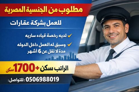 Wanted Egyptian Driver for real estate Company Requirements Valid driving license Minimum 6 months experience working in the UAE Salary AED1700 + accommodation Contact