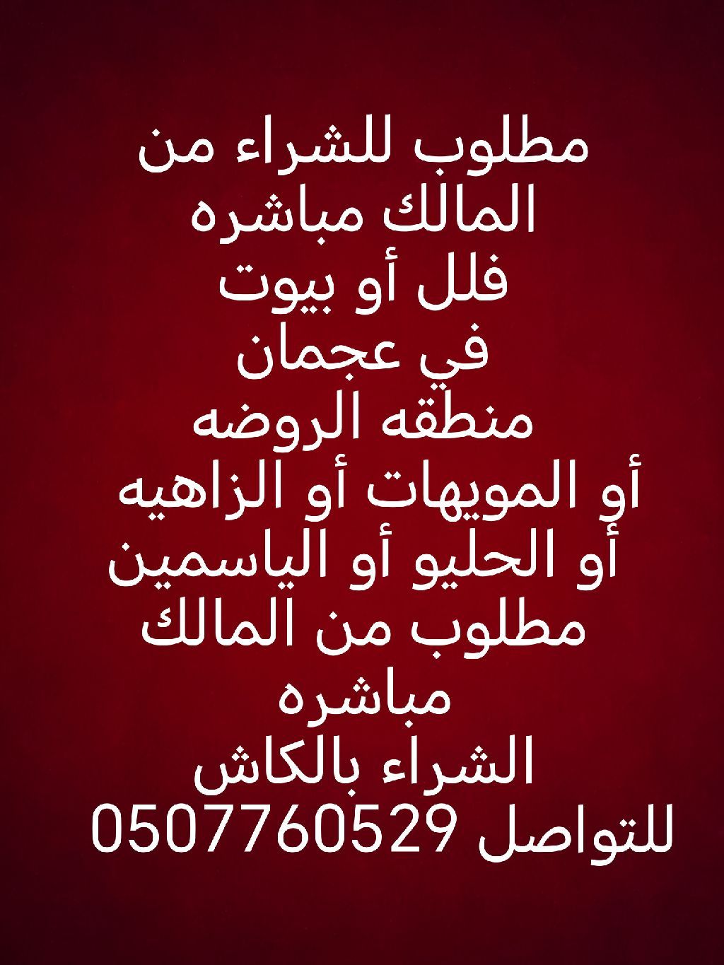 مطلوب للشراء عقارات في عجمان مطلوب فلل أو أراضي للشراء في عجمان منطقة الزاهية / الحليو / الياسمين / الروضة المويهات مطلوب للشراء من المالك مباشرة الشراء بالكاش للتواصل