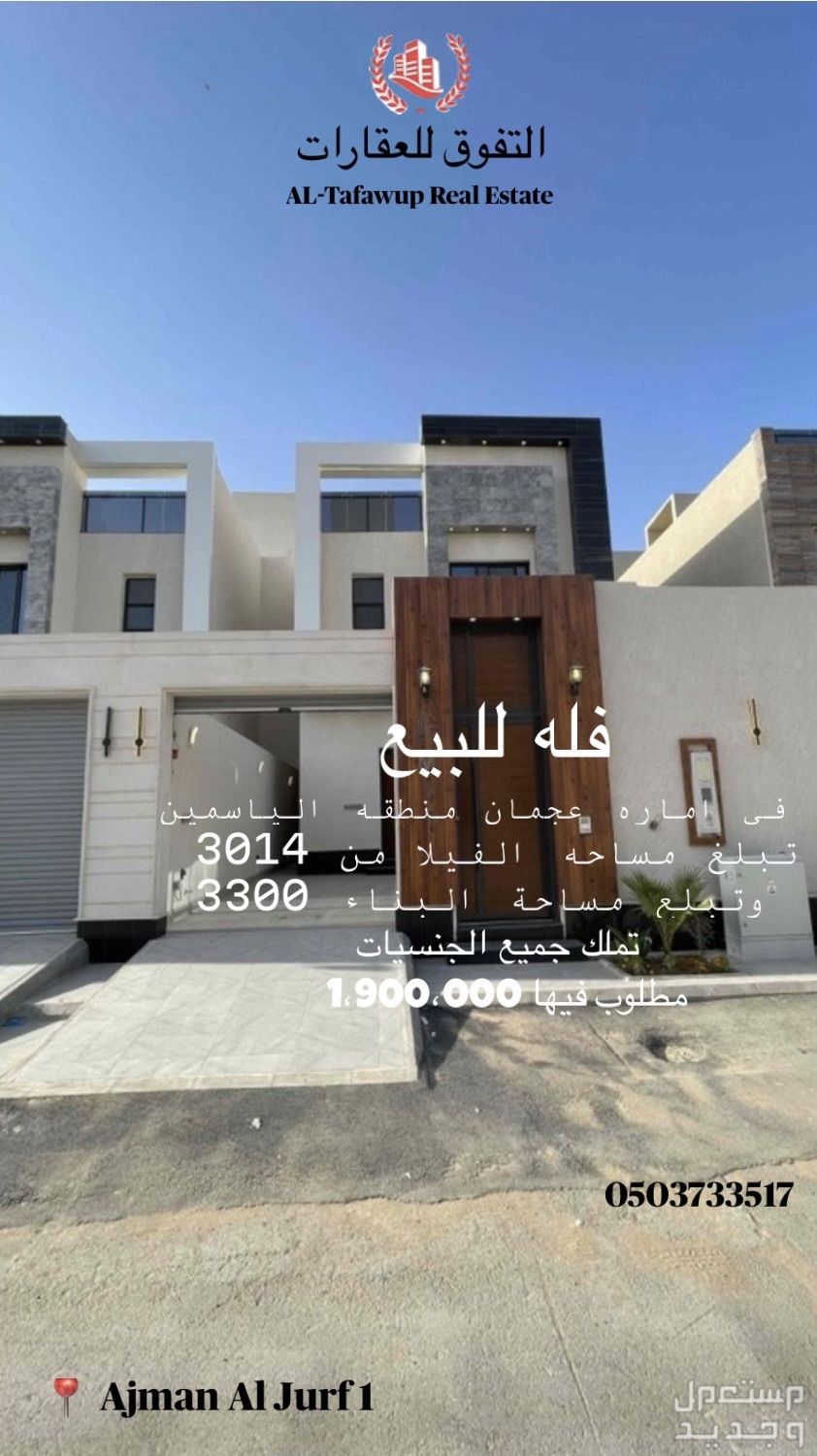 للبيع فيلا في منطقة الياسمين في إمارة عجمان مكونة من 5 غرف ماستر صالتين مطبخ مجلس غرفة مساعدة غرفة الغسيل كراج لسيارتين شلال مساحة الأرض 3014 قدم مساحة البناء 3300 قدم الفيلا ملبسة حجر كامل أربع جهات + سور داخلي + سور خارجي مزود بكاميرات المراقبة تملك حر لجميع الجنسيات مطلوب في الفيلا 1950000 درهم شامل التسجيل والكهرباء والمياه