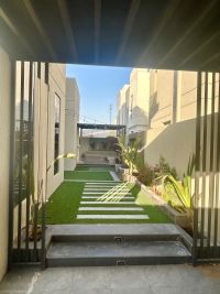 Villa for sale in Al Yasmin 3 floors, 5 master bedrooms, Majlis living room and maid room, fully equipped kitchen, garden with waterfall and outdoor seating, internal garage, security cameras and fire alarms, ready to move in, modern design, one year villa warranty and twenty year roof insulation warranty