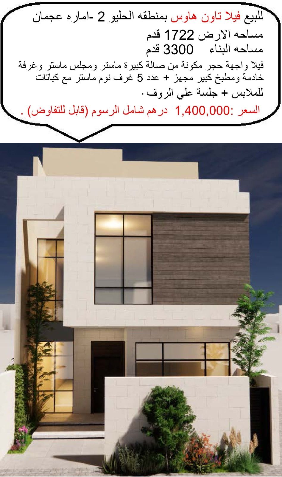 للبيع فيلا تاون هاوس بمنطقة الحليو 2 - إمارة عجمان مساحة الأرض 1722 قدم مساحة البناء 3300 قدم الفيلا مكونة من صالة كبيرة ماستر ومجلس ماستر وغرفة خادمة ومطبخ كبير مجهز + عدد 5 غرف نوم ماستر مع كباتات للملابس + جلسة علي الرووف. السعر 1400000 درهم شامل الرسوم بدون عمولة