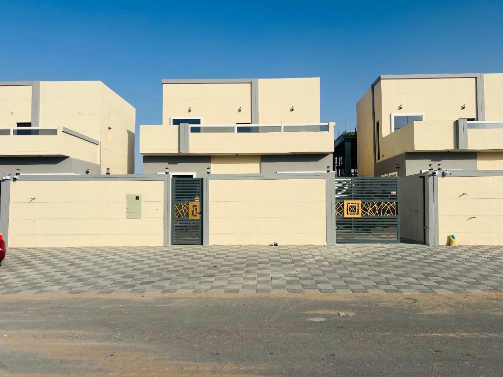 Luxury villa for sale in Al Zahya, land area 3014 SqFt, built area 3200 SqFt, two floors with roof. Includes a Majlis, spacious hall, 3 master bedrooms, 5 bathrooms, main fully equipped kitchen, and prep kitchen. Front parking setback and large yard. Price AED1300000 including registration, negotiable