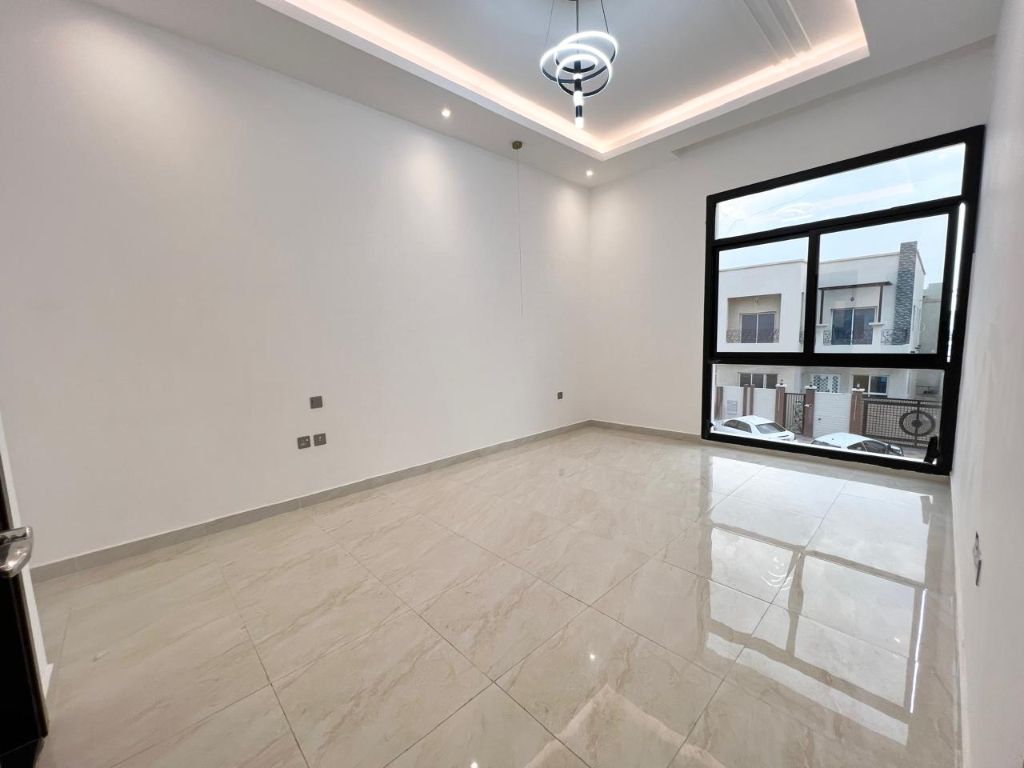 Townhouse for annual rent in Al Zahia, ready to move in. It consists of two floors plus a roof terrace, ground floor, first floor, and roof terrace, a Majlis and living room, 5 master bedrooms, 7 bathrooms, a fully equipped main kitchen and preparation kitchen, and full split air conditioning. The price is AED95000 payable in 4 installments