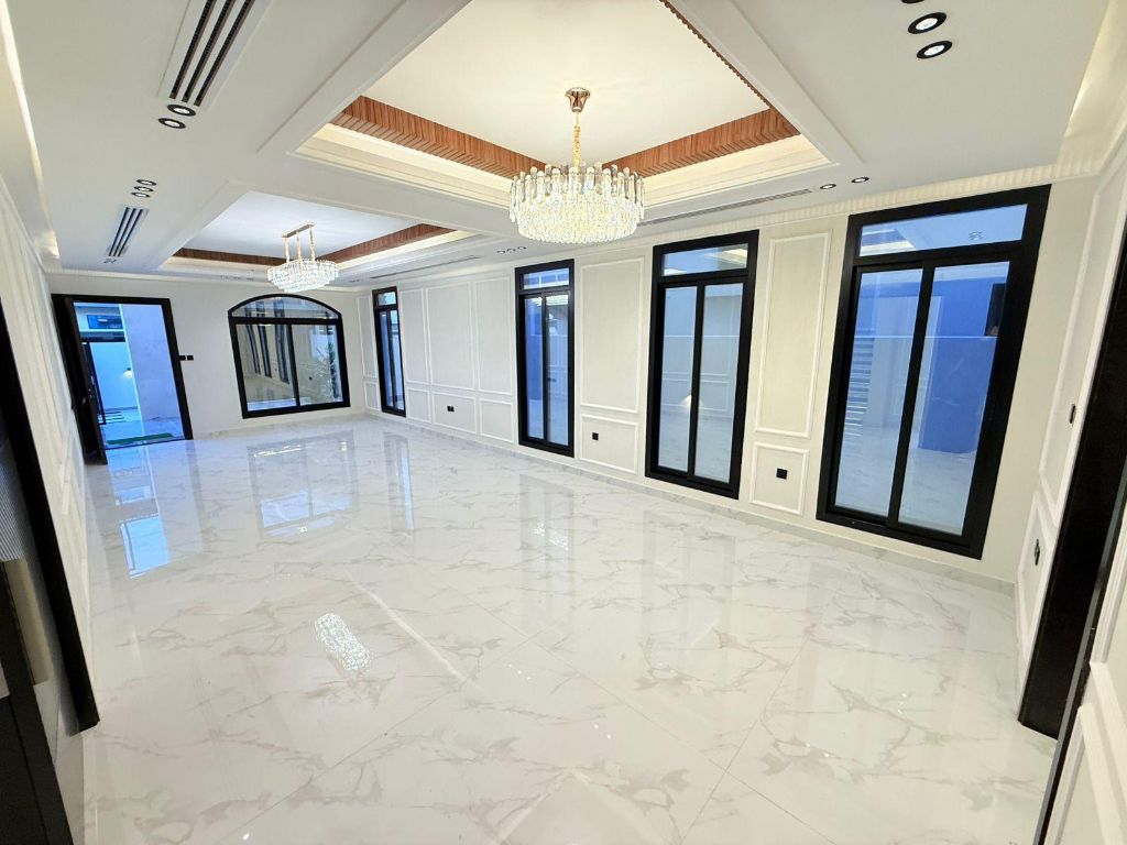 Villa for sale in Ajman On Al Zahia Roundabout Land area 3014 SqFt Built - up area 3650 SqFt Three - story villa 5 master bedrooms Majlis with washrooms and bathroom Ras Al-Khaimah ceramic tiles Large living room with bathroom Maid's room Ras Al-Khaimah bathroom fixtures Full Syrian stone cladding Price 1880000