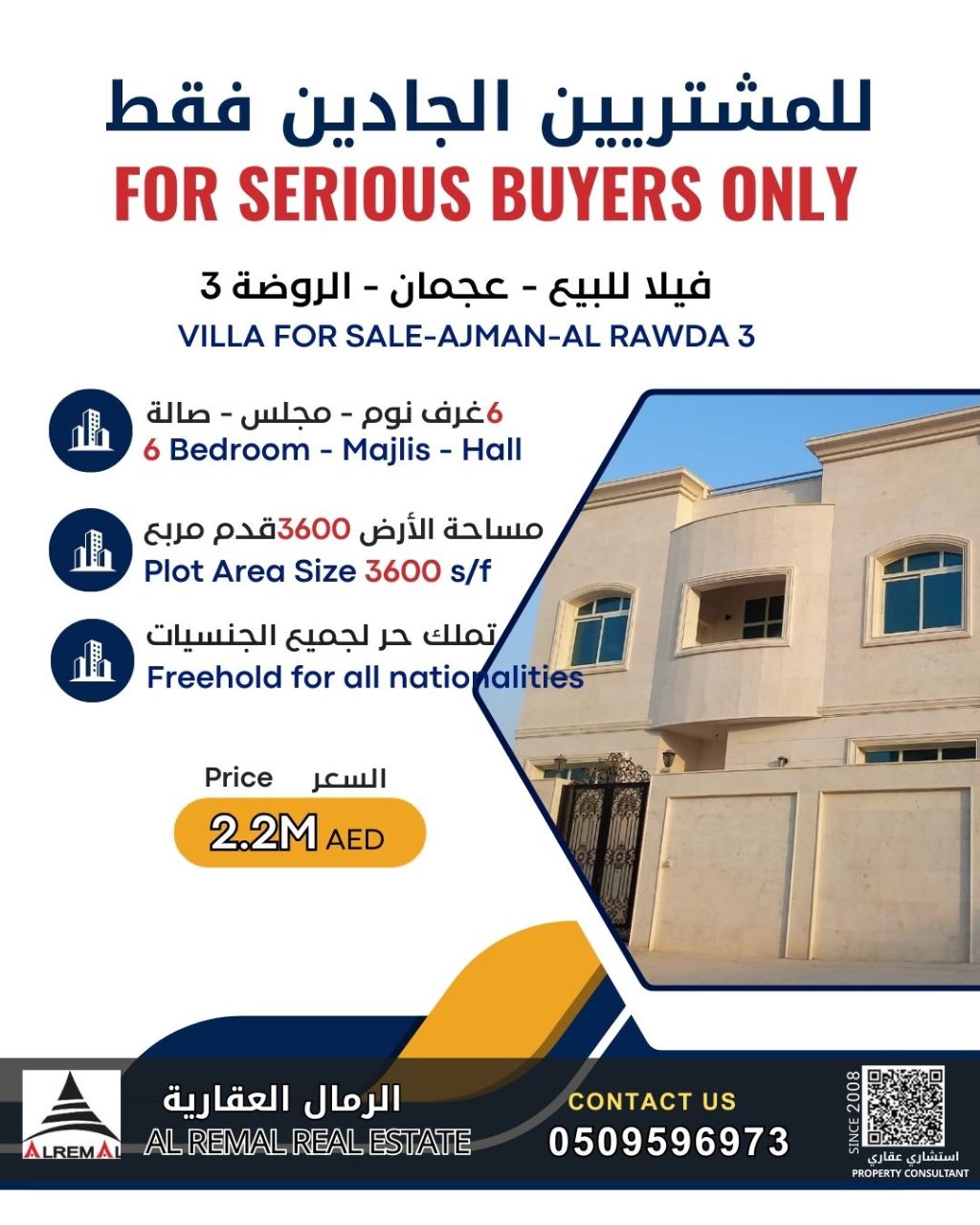 فيلا فاخرة للبيع - الروضة 3 Corner Villa فرصة مميزة للسكن العائلي الراقي فيلا حديثة أول ساكن بموقع استراتيجي في الروضة 3، تصميم عملي وتشطيبات عالية الجودة، مناسبة للسكن أو الاستثمار. السعر المطلوب 2200000 درهم المساحة 3600 قدم مربع الموقع الروضة 3 - فيلا زاوية المواصفات 6 غرف نوم واسعة 6 حمامات مجلس أنيق + صالة في الدور الأرضي صالة عائلية في الدور الأول موقف سيارات داخلي يتسع لسيارتين تكييف