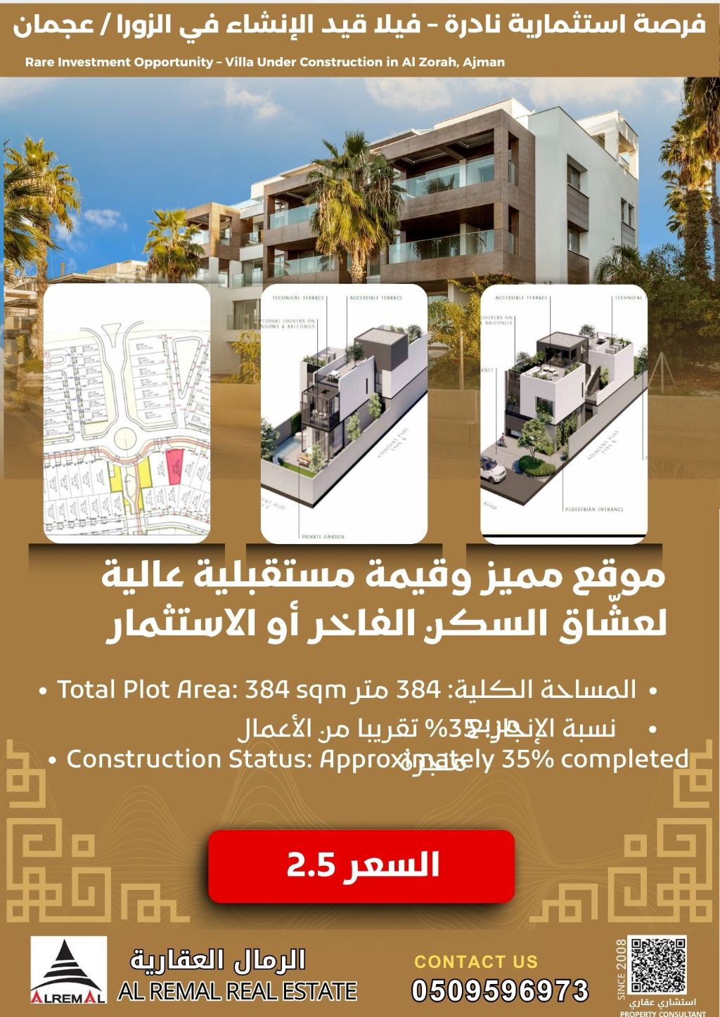 فرصة استثمارية نادرة - فيلا قيد الانشاء في الزورا / عجمان للبيع فيلا سكنية (أرضي + أول) في واحدة من أرقى مناطق إمارة عجمان - منطقة الزورا موقع مميز وقيمة مستقبلية عالية لعشاق السكن الفاخر أو الاستثمار الذكي. المساحة الكلية 384 متر مربع نسبة الانجاز 35% تقريبا من الأعمال منجزة سبب البيع للضرورة السعر المطلوب 2500000 درهم ميزة الفرصة امكانية اكمال البناء والتشطيب حسب ذوقك الخاص وفي منطقة راقية