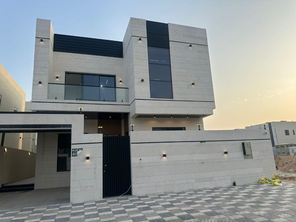 Villa for sale in Al Helio 2, Ajman Gardens Scheme Deluxe villa Consisting of 5 bedrooms, a Majlis, a living room, a kitchen, a maid's room, a preparation kitchen, exterior stone cladding, and an internal garden Land area 3014 SQM Built - up area approximately 3400 SQM asking price AED1700000 including registration fees