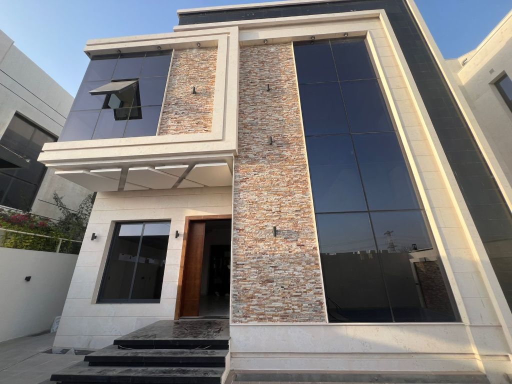 Villa for sale in Ajman, Al Yasmeen. Plot area 3014 SqFt, built - up area 2800 SqFt. Features 3 master bedrooms, main kitchen + prep kitchen, swimming pool, carport, maid’s room, 5 - meter setback. Price AED1580000