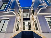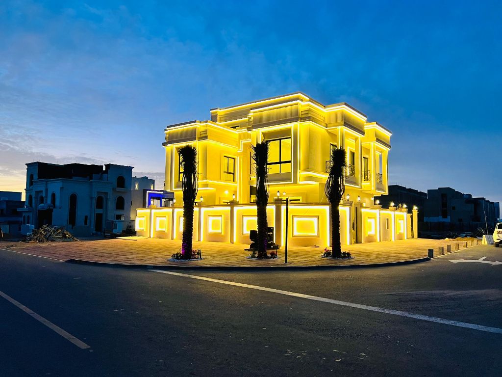 Luxury classic villa for sale in Al Helio 2 Ajman, G 2 floors on a corner plot facing park and near mosque, 5000 SqFt built - up area, includes 6 master bedrooms, 3 spacious halls, Majlis, main and prep kitchen, maid room, outdoor swimming pool, high - end finishing, price AED3200000 all inclusive