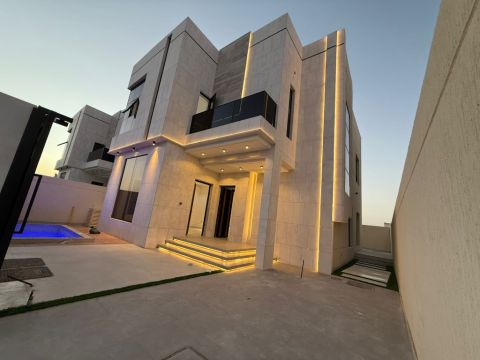 For sale Modern villa with an elegant design in Al Zahya 2 - Ajman Location Al Zahya - Ajman Area Land 3014 square feet - Building 3800 square feet Specifications Consists of a ground floor + first floor + roof - 6 spacious master bedrooms - Independent living room - Large hall with a modern design - Main kitchen - Private swimming pool - Spacious internal courtyard - 8 - meter front setback