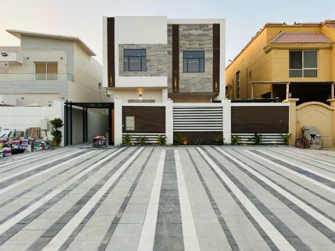For sale in Ajman - Luxury Villa in Al Yasmeen Elegant villa consisting of 5 master bedrooms 2 living halls Equipped kitchen Spacious Majlis Maid’s room Laundry room Garage for 2 cars Waterfall feature Land area 3014 SqFt. Built - up area 3300 SqFt. Fully stone - clad on all four sides with internal and external walls Equipped with surveillance cameras Prime location with high - end design, available