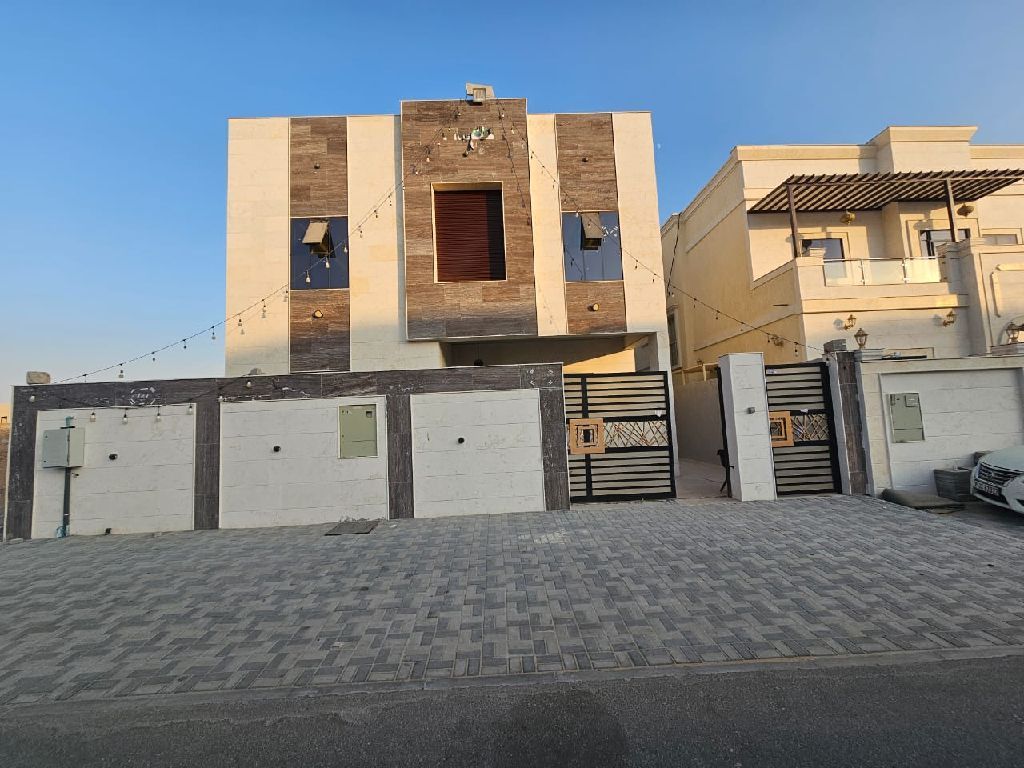 فيلا للإيجار في عجمان منطقة الزاهية 3 طوابق 5 غرف ماستر وصالة ومجلس ومطبخ وغرفة خادمة وحوش ومساحة رووف الفيلا جاهزة مع الكهرباء والمياه والمكيفات التأمين شيك