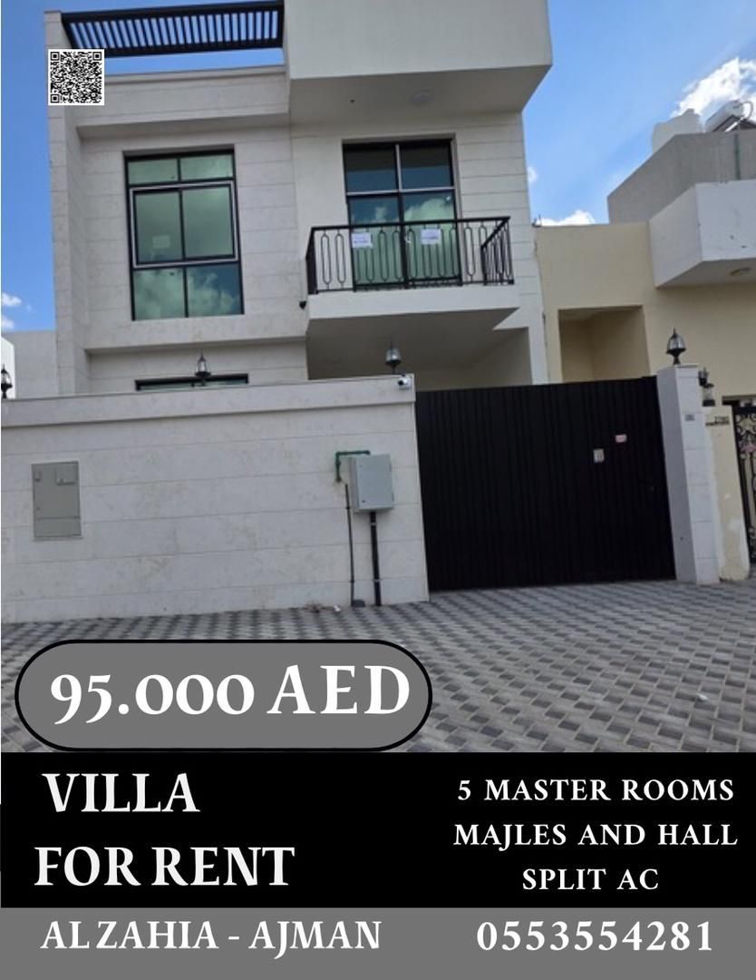فيلا للإيجار بمنطقة الزاهية في عجمان 5 غرف صالة ومجلس مطبخ واسع. أول ساكن الزاهية 90 ألف