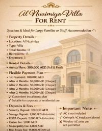 هذا ملخص للاعلان فيلا للإيجار في النعيمية 17 غرفة، 13 حمام، 3 مداخل - الإيجار السنوي 300000 درهم - الدفعات دفعة أولى 100000 درهم - بعد 4 شهور 50000 درهم - بعد شهرين 50000 درهم - بعد شهرين 50000 درهم - بعد شهرين 50000 درهم - تأمين 10000 درهم (مسترد) مصاريف اضافية صرف صحي 1500 درهم - رسوم بلدية 3000 درهم - عمولة 15000 درهم