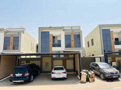 Brand new villa for annual rent in Al Zahia, Ajman. 5 master bedrooms, living room, Majlis, kitchen, maid's room, and rooftop with jacuzzi and carport. rent AED90000