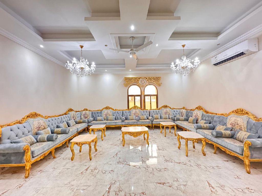 Villa for rent in Al Al Mwaihat 1 Ground floor + first floor, 5 semi furnished rooms, living room and sitting room furnished. Land area 5000 square feet, large internal courtyard with an external sitting room. Required price 115000