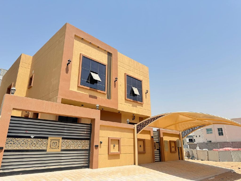 Villa for rent, first occupant, in Al Helio area, Ajman, excellent location, 5 - bedroom villa, Majlis, hall, kitchen, maid's room, ready for occupancy, at an excellent price of 95000 annually