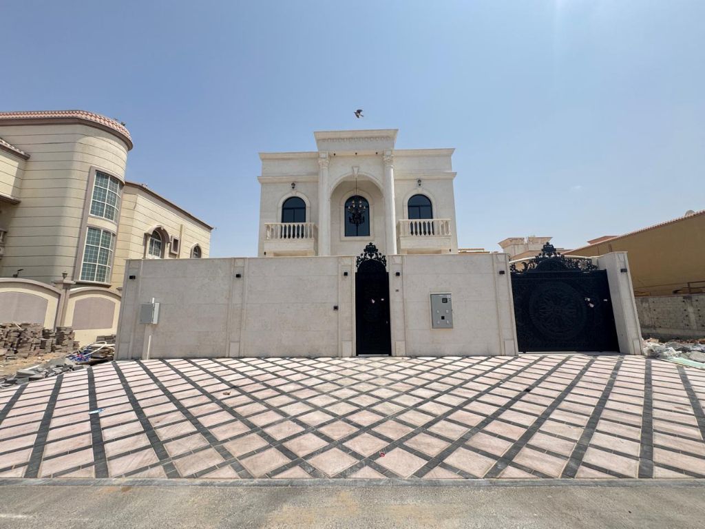 Luxurious villa with high - end finishing (first inhabitant) for rent in Al Rawda 2, consisting of ground floor + first floor + roof, fully stone, includes 7 spacious master bedrooms, 10 bathrooms, men'Majlis, women'hall, maid's room, large kitchen with storage, central air conditioning, spacious courtyard, front parking, and a large roof, with a building area of