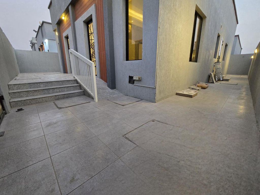 Ground floor villa for rent in Al Zahia, Ajman. It consists of 3 master bedrooms, a family hall, a sitting room with laundry facilities, a fully equipped kitchen, a maid's room, and a small courtyard. The final price is 85000