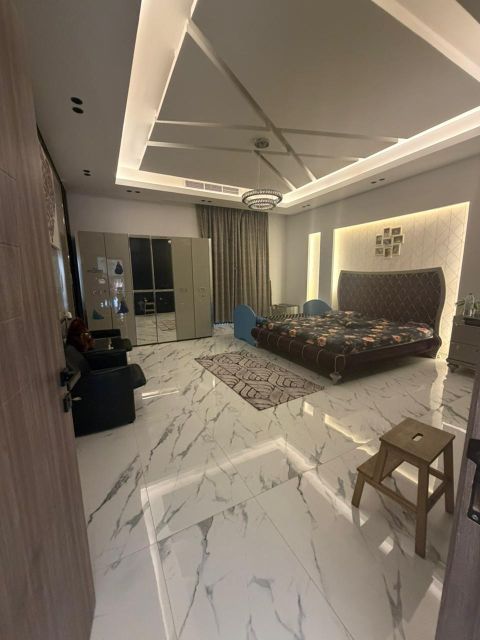 A 5 - bedroom villa for rent in Ajman, first occupant. The Villa consists of 3 floors. First floor A large living room with a guest bathroom. A master bedroom with built - in wardrobes. A master bedroom with built - in wardrobes. A very large kitchen with numerous cabinets. A laundry room. Second floor A large hall. A prep kitchen. Three spacious bedrooms, all master bedrooms with built - in wardrobes