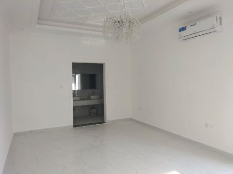 Luxury villa for rent in Ajman, Al Zahiyah area, first occupancy, with 5 master bedrooms, a Majlis, a living room, and a large ground - floor kitchen. asking price AED95000 (negotiable)
