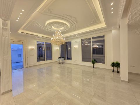 For annual rent in Ajman A standalone villa located in Al Helio 2 The Villa is brand new, first - time occupancy, with super deluxe finishing and a modern interior layout designed for comfort and privacy. The Villa consists of five master bedrooms with a total of eight bathrooms. Upper Floor includes four master bedrooms Each room features built - in wardrobes There is also a balcony providing a nice