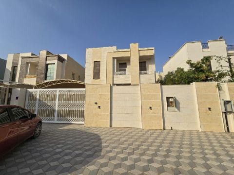Luxury villa for rent in Ajman, Al Zahiyah area, first occupancy, with 5 master bedrooms, a Majlis, a living room, and a large ground - floor kitchen. asking price AED95000 (negotiable)