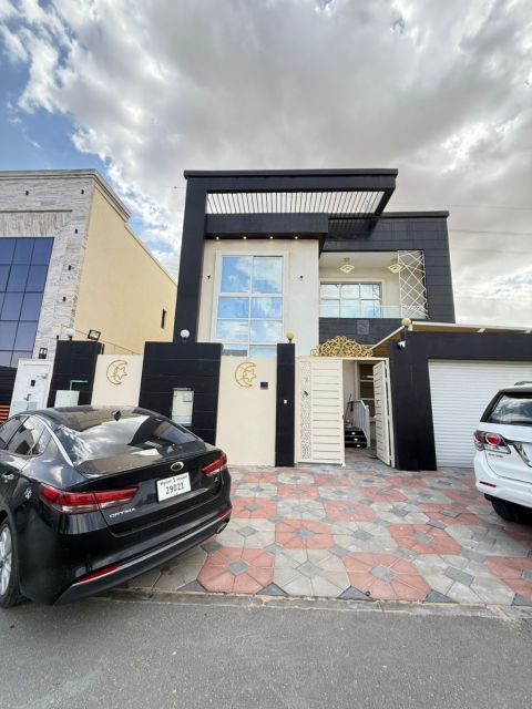 Villa for rent in Ajman Al Rawda 2 area Second plot from Sheikh Ammar Street Two floors plus a roof terrace, 5 master bedrooms, living room, Majlis, kitchen, maid's room, and yard The Villa is on an asphalt road Area 4500 SqFt Price AED130000 4 installments Contact