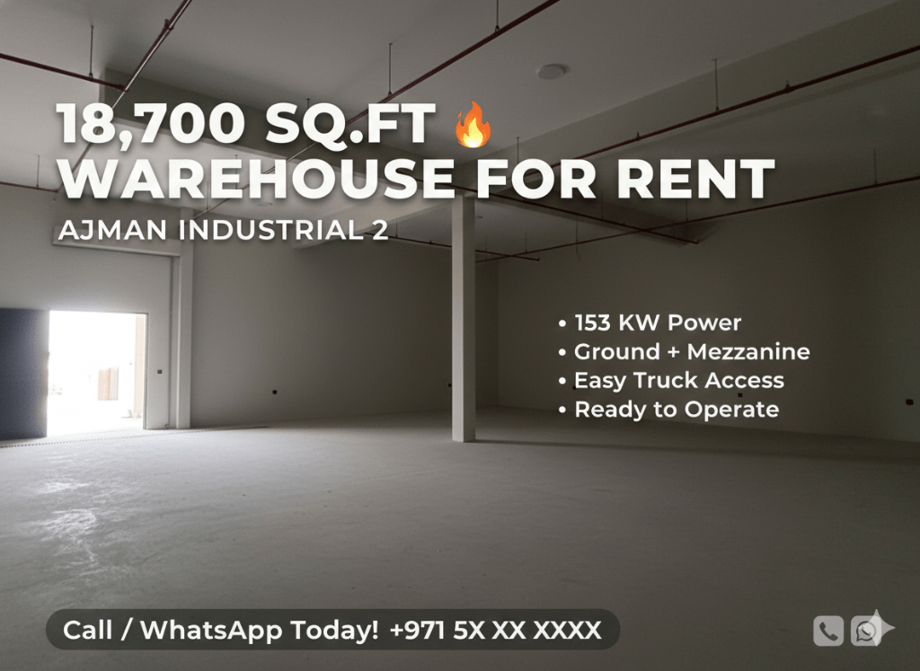 مستودع للإيجار السنوي - عجمان الصناعية 2 الموقع عجمان الصناعية 2 المساحة الكلية 18700 قدم مربع التصميم أرضي + ميزانين منطقة لوجستية 5060 قدم مربع الكهرباء 153 كيلو وات الاستخدام مناسب للتخزين، التوزيع، المصانع والشركات الكبرى التأمين 10% كاش من القيمة موقع استراتيجي، حركة شاحنات سهلة، وجاهز للتشغيل فورا