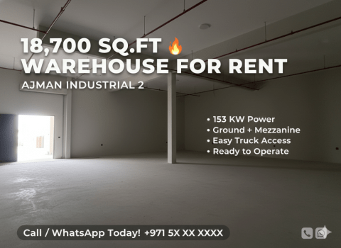 Annual Warehouse for rent - Ajman Industrial 2 Location Ajman Industrial Area 2 Total Area 18700 SqFt Layout Ground + Mezzanine Logistics Area 5060 SqFt Power 153 KW Usage Ideal for storage, distribution, factories & large companies Security Deposit 10% cash Strategic location, easy truck access & ready for immediate operation