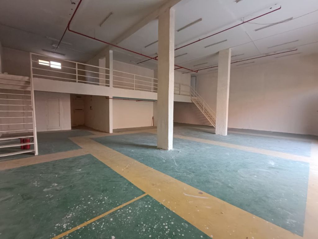 Warehouse for rent in Al Jerf Industrial 1 Consisting of a ground floor and mezzanine Ground floor 2250 square feet Mezzanine 650 square feet Equipped with a bathroom and office space