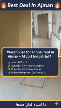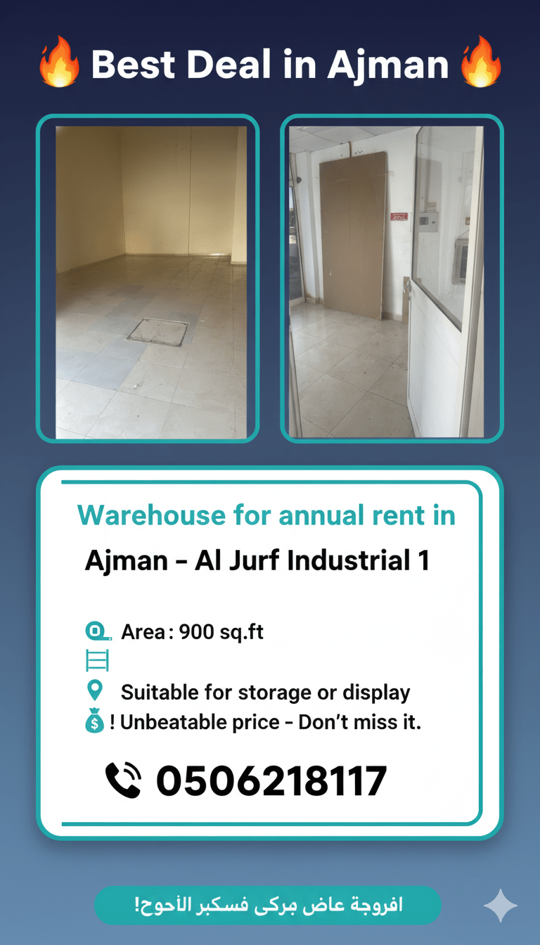 Best Deal in Ajman Warehouse for annual rent in Ajman - Al Jerf Industrial 1 Area 900 SqFt Suitable for storage or display Prime location, easy access Unbeatable price - Don’ t miss it عجمان مي سب سي سستا سالانه كراىه ر كودام - الجرف انسرىل 1 سائز 900 مربع في اسورىج أ سلى كي لي بهترىن أسان رسائى، شاندار جكه قىمت حىران كن عجمان كودام