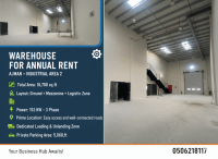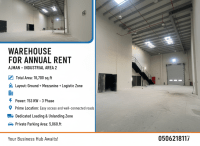 Warehouse for Annual rent in Ajman Industrial Area 2 Total Area 18700 SqFt Layout Ground + Mezzanine + Logistic Zone Power 153 KW - 3 Phase Prime Location easy access and well - connected roads Dedicated Loading & Unloading Zone Private Parking Area 5060 SqFt Perfect for factories, logistics, or storage businesses Don’ t miss this opportunity - book your warehouse now