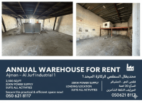 Annual warehouse for rent in Ajman - Al Jerf Industrial 1, offering 2500 SqFt with 20KW power supply, located in a prime and easily accessible area near main roads. The warehouse includes designated loading and unloading zones and suits most commercial and Industrial activities. A perfect choice for businesses seeking a practical and efficient location. Contact us now to secure this unit before it’s