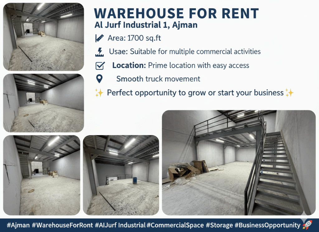 Warehouse for rent - Al Jerf Industrial 1, Ajman Area 1700 SqFt Power 20 KW Usage Suitable for multiple commercial activities Location Prime location with easy access Smooth truck movement Perfect opportunity to grow or start your business