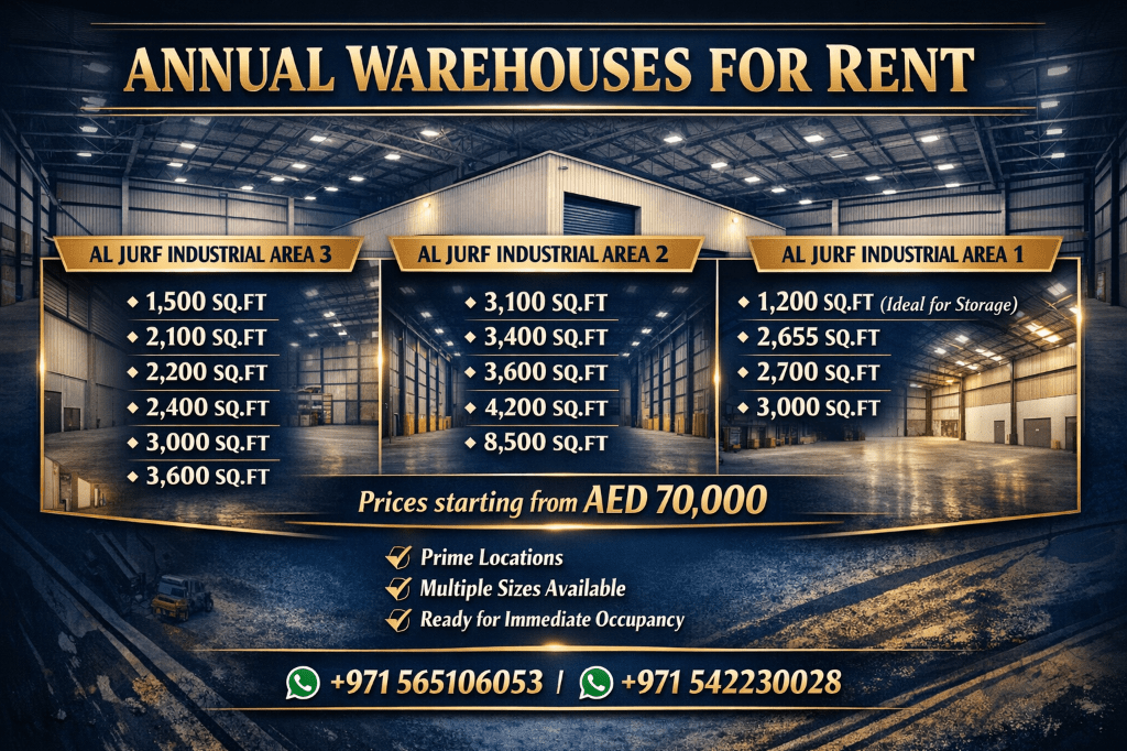 ANNUAL WAREHOUSES for rent Prime Industrial Locations - Ajman Discover a wide selection of warehouses for annual rent in Al Jerf Industrial Areas 1, 2 & 3, offering flexible spaces to suit all commercial, Industrial, and storage activities. Al Jerf Industrial Area 3 - 1500 SqFt - 2100 SqFt - 2200 SqFt - 2400 SqFt - 3000 SqFt - 3600 SqFt Al Jerf Industrial Area 2 - 3100 SqFt - 3400 SqFt - 3600