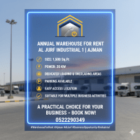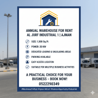Annual Warehouse for rent - Al Jerf Industrial 1 Ajman Size 1500 SqFt Power 20 KW Dedicated loading & unloading areas Parking available easy access location Suitable for multiple business activities A practical choice for your business